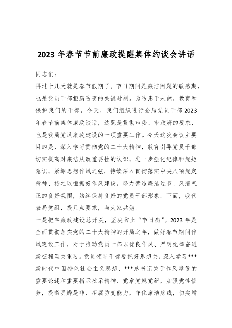 / 2023年春节节前廉政提醒集体约谈会讲话稿