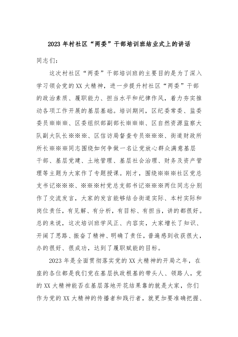 2023年村社区“两委”干部培训班结业式上的讲话稿