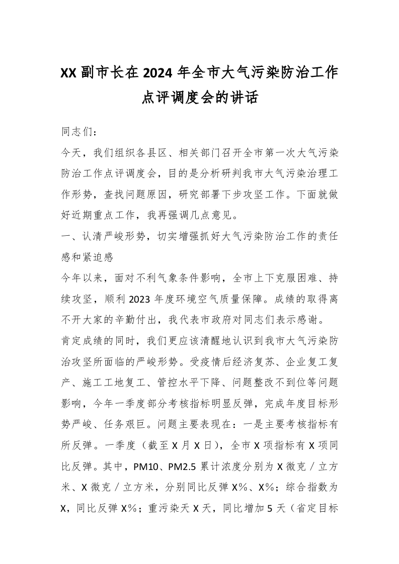 XX副市长在2024年全市大气污染防治工作点评调度会的讲话稿