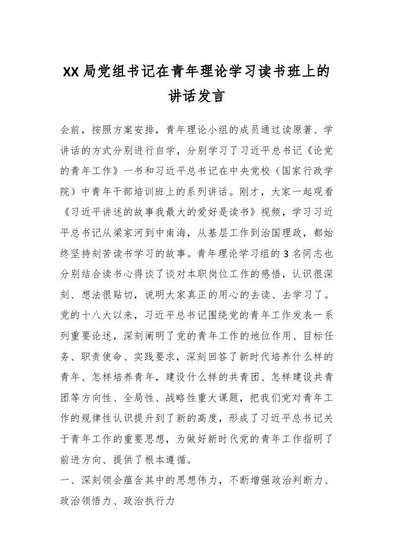 / XX局党组书记在青年理论学习读书班上的讲话稿发言稿
