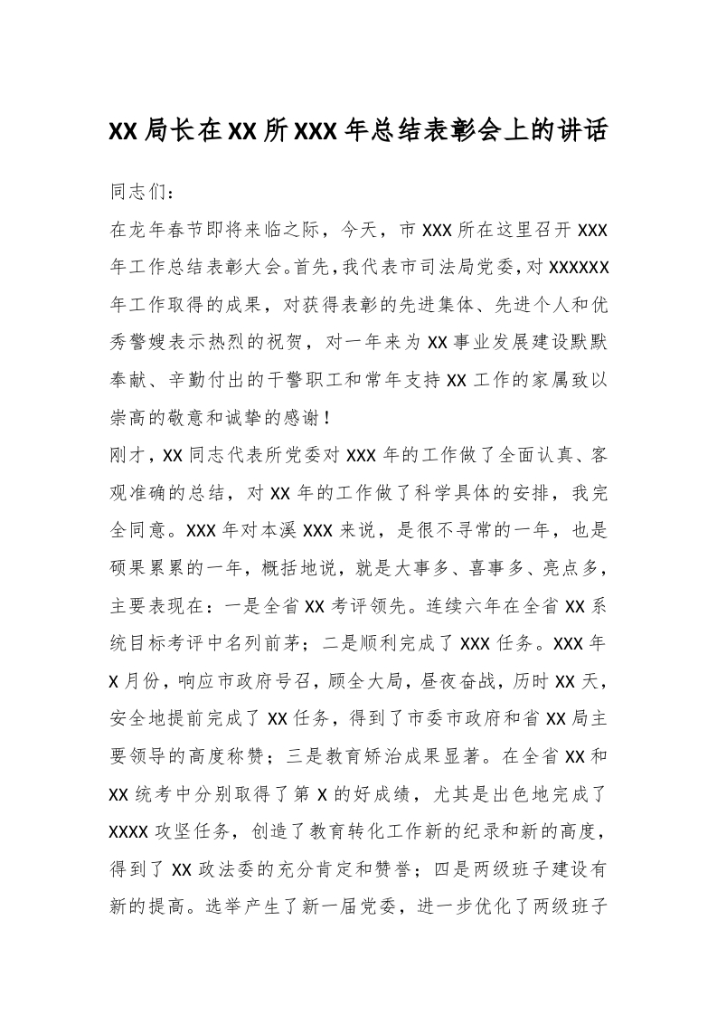 / XX局长在XX所XXX年总结表彰会上的讲话稿