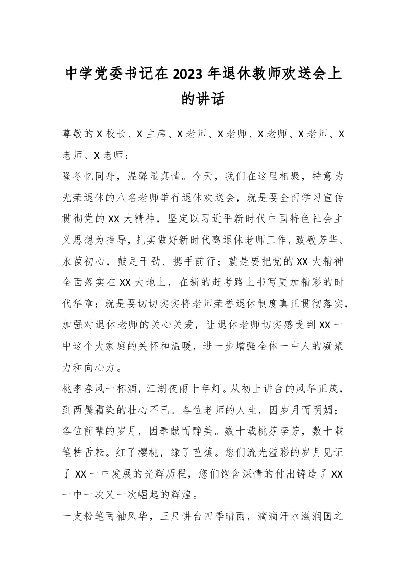 中学党委书记在2023年退休教师欢送会上的讲话稿