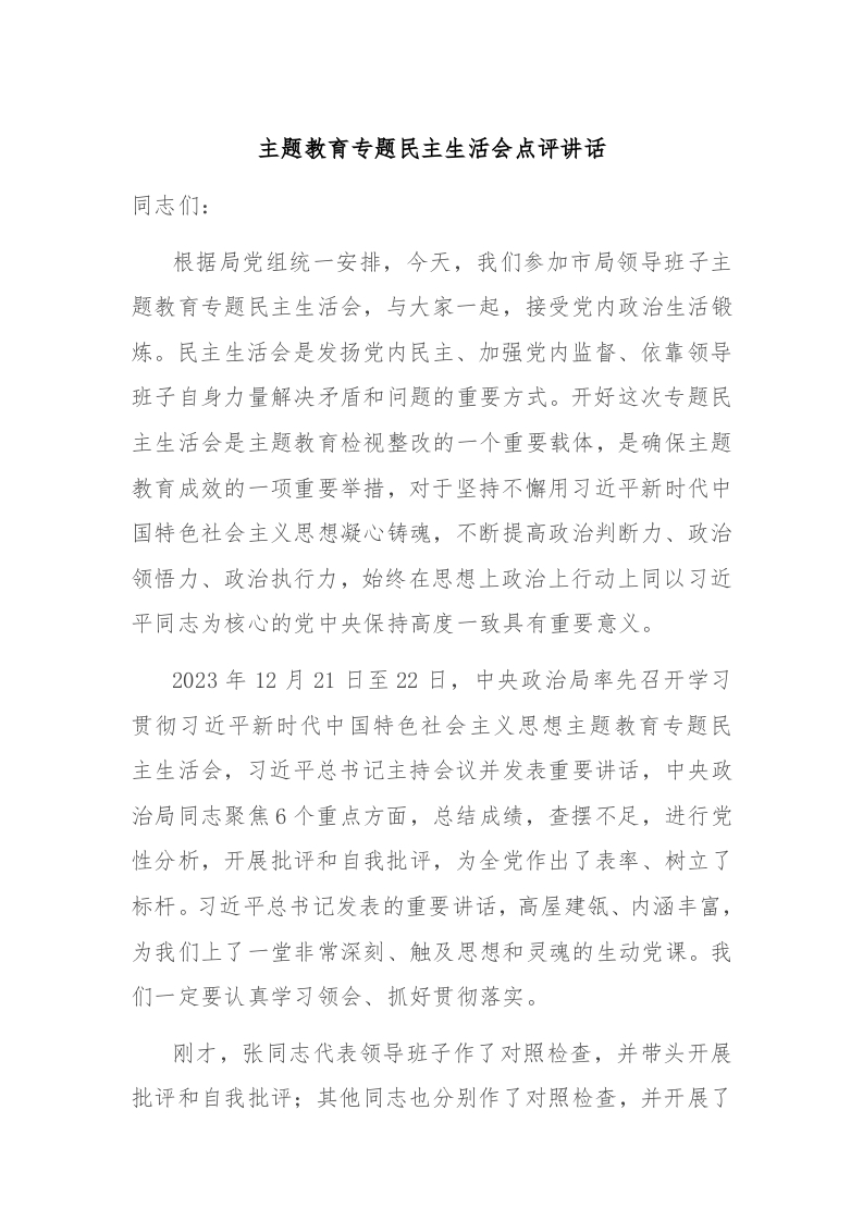 / 主题教育专题民主生活会点评讲话稿