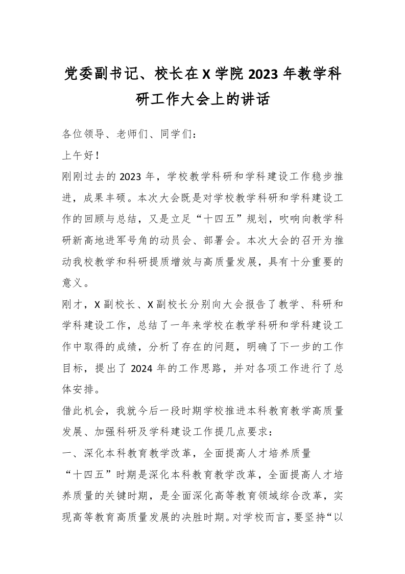 / 党委副书记、校长在X学院2023年教学科研工作大会上的讲话稿