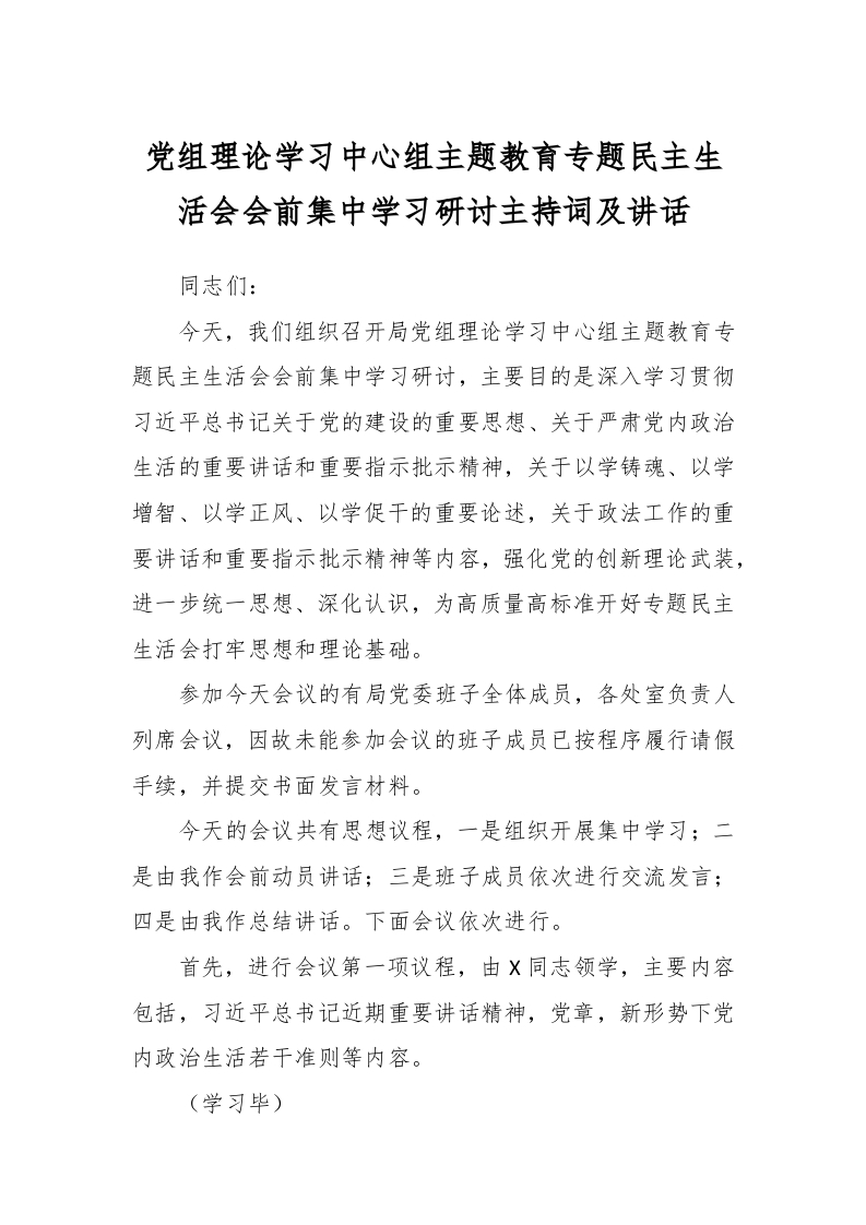 / 党组理论学习中心组主题教育专题民主生活会会前集中学习研讨主持词及讲话稿