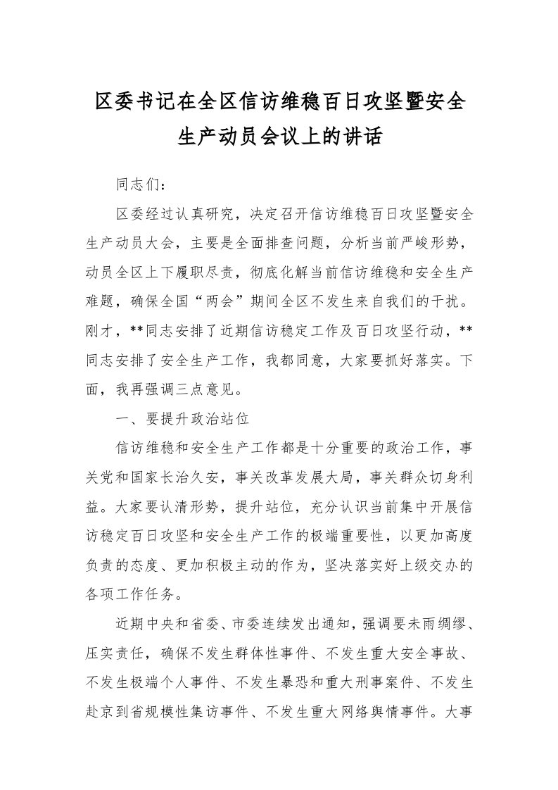 / 区委书记在全区信访维稳百日攻坚暨安全生产动员会议上的讲话稿