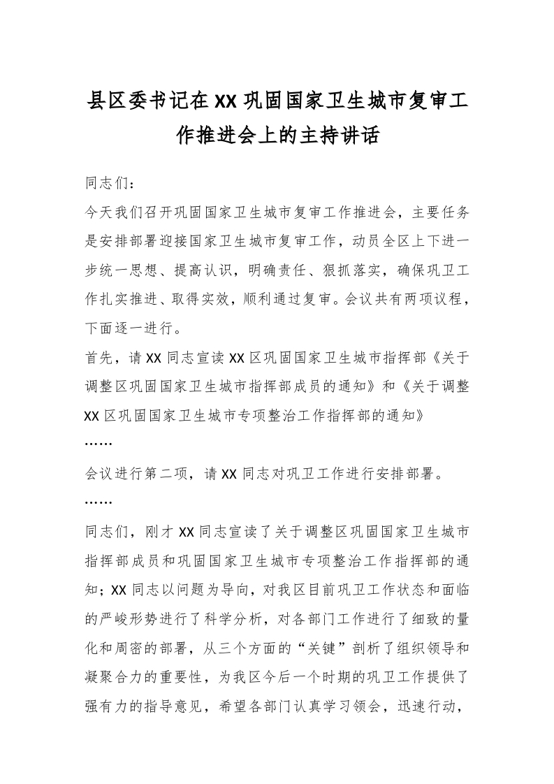 / 县区委书记在XX巩固国家卫生城市复审工作推进会上的主持讲话稿