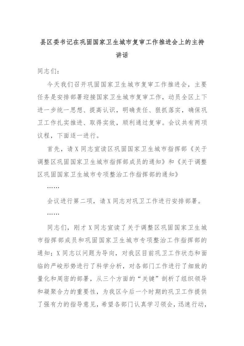 / 县区委书记在巩固国家卫生城市复审工作推进会上的主持讲话稿