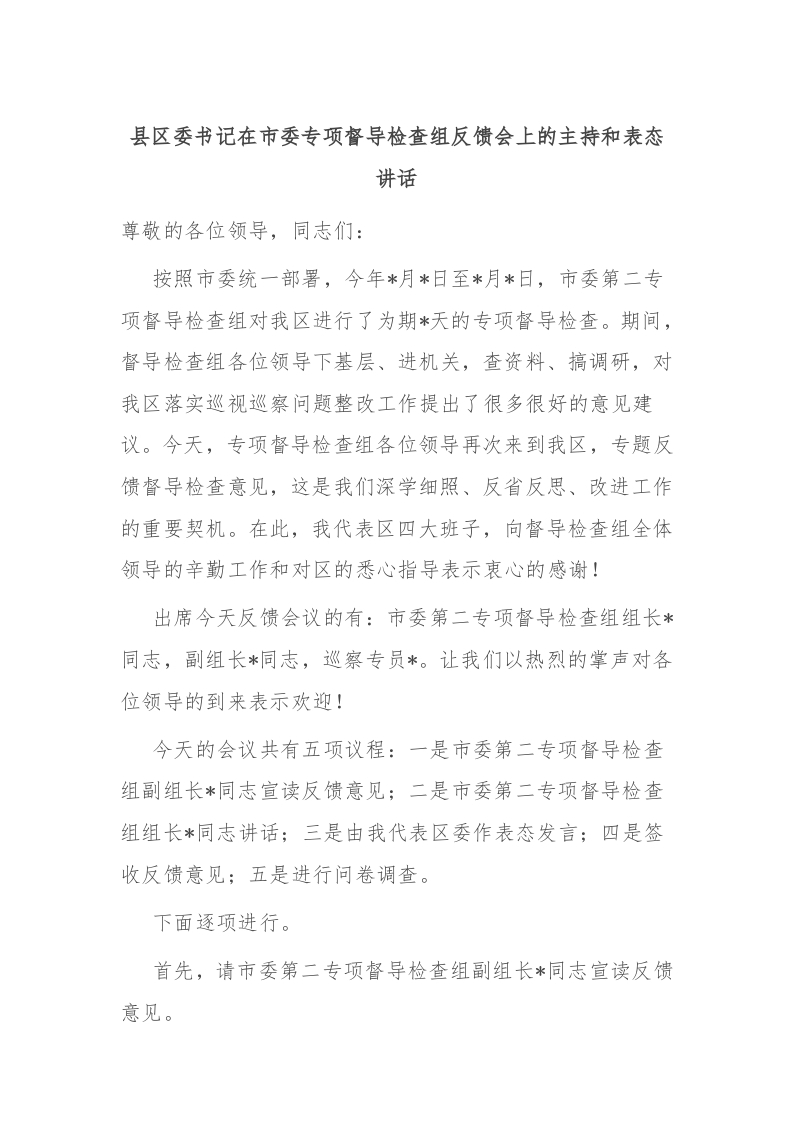 / 县区委书记在市委专项督导检查组反馈会上的主持和表态讲话稿
