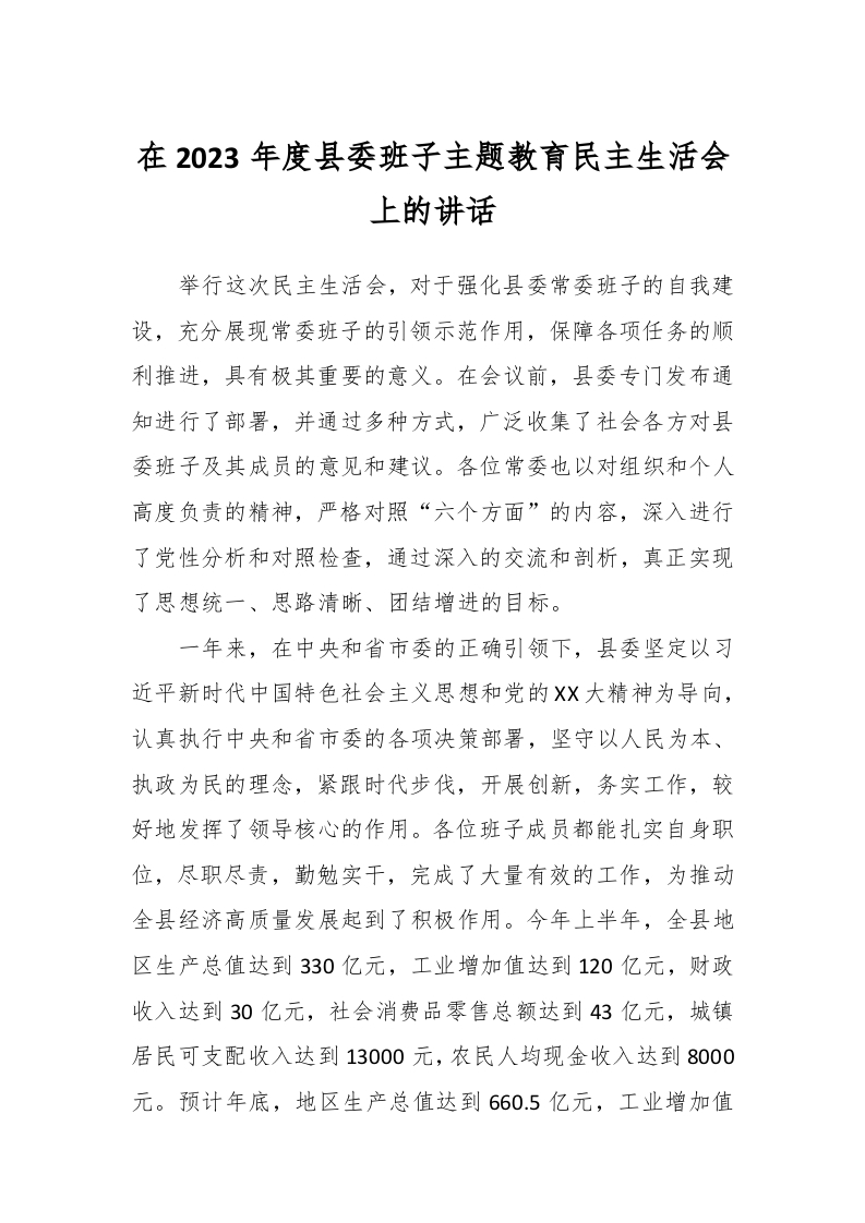 / 在2023年度县委班子主题教育民主生活会上的讲话稿