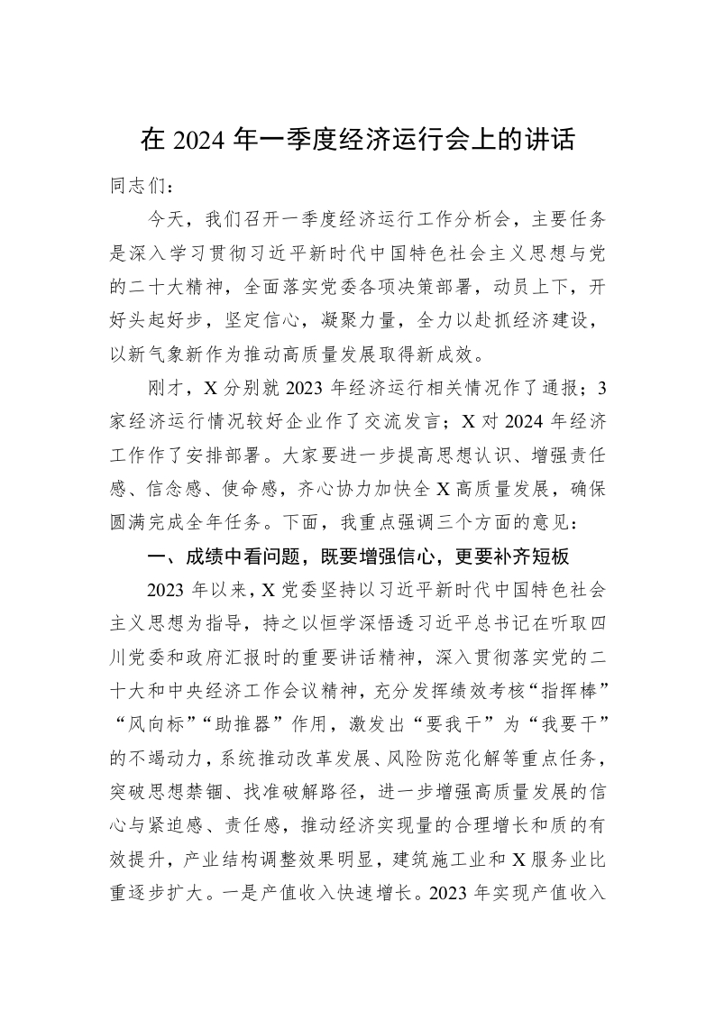 / 在2024年一季度经济运行会上的讲话稿