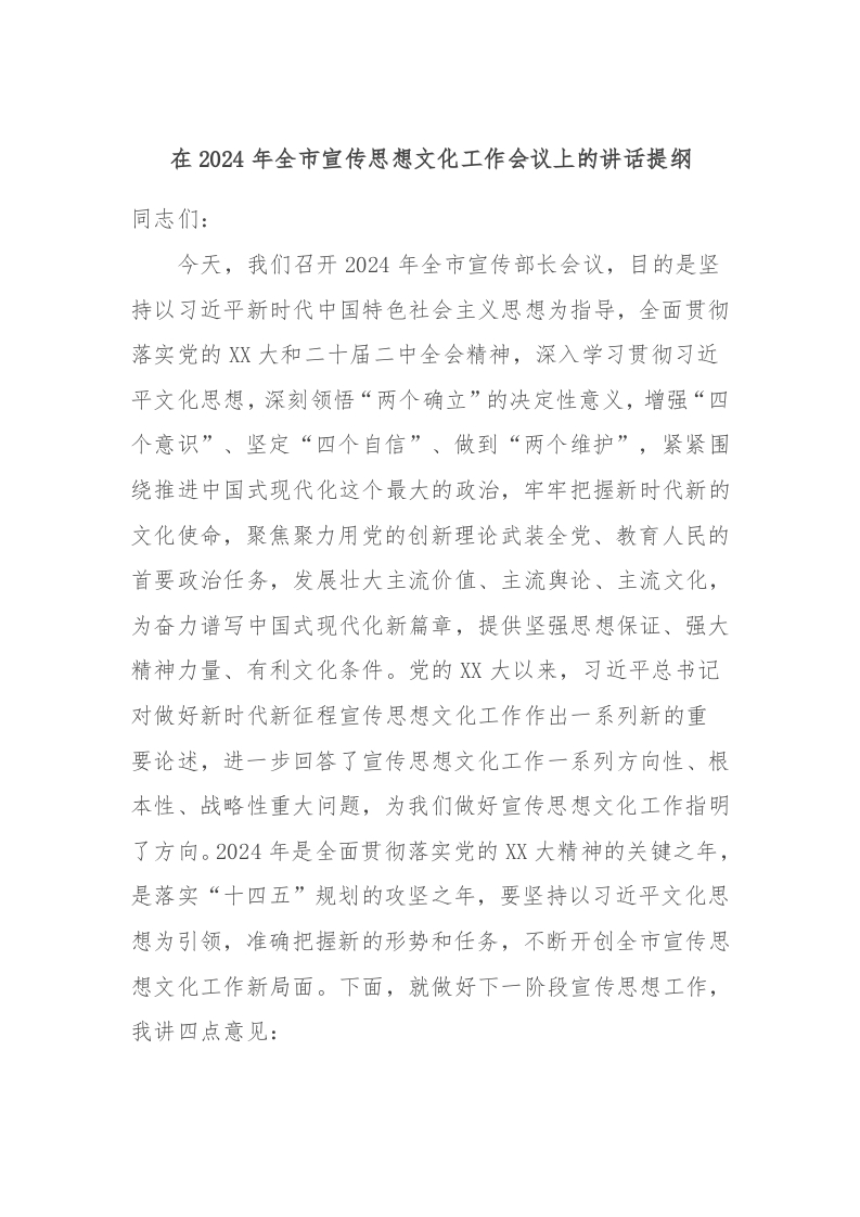 / 在2024年全市宣传思想文化工作会议上的讲话稿提纲