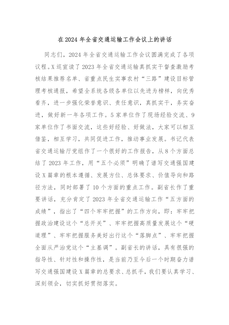 / 在2024年全省交通运输工作会议上的讲话稿