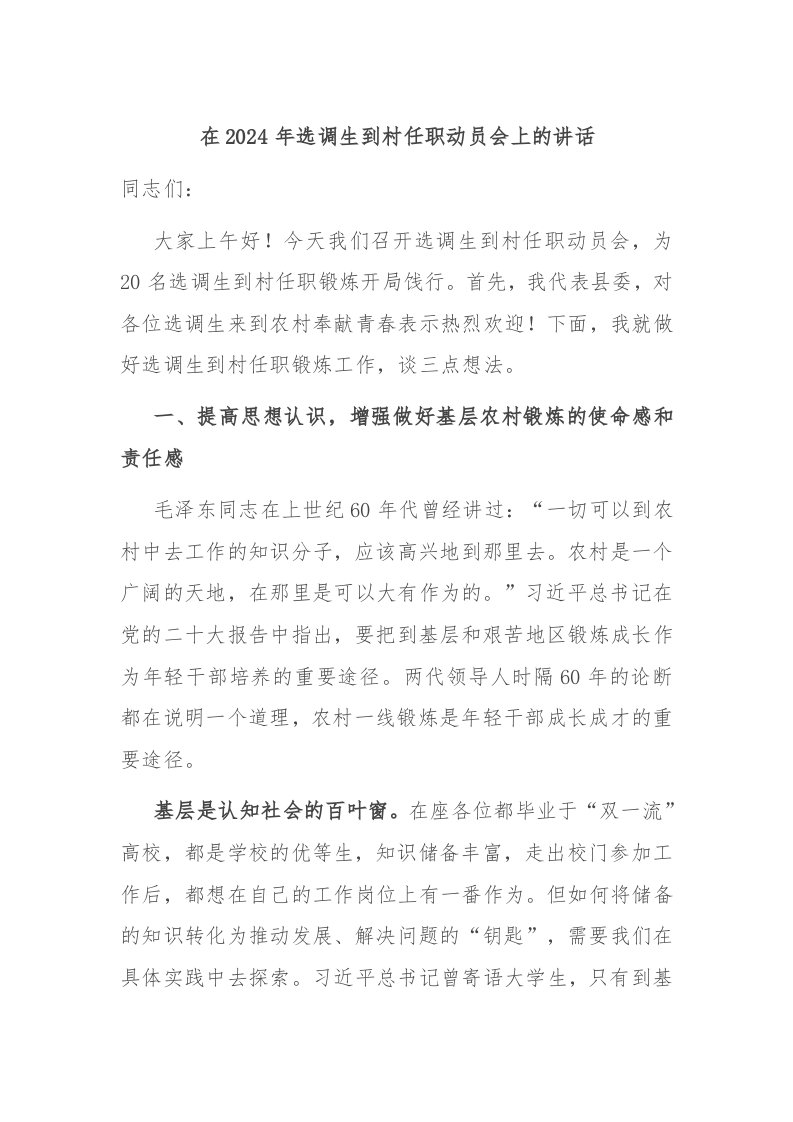 / 在2024年选调生到村任职动员会上的讲话稿