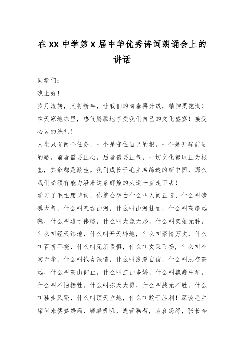 / 在XX中学第X届中华优秀诗词朗诵会上的讲话稿