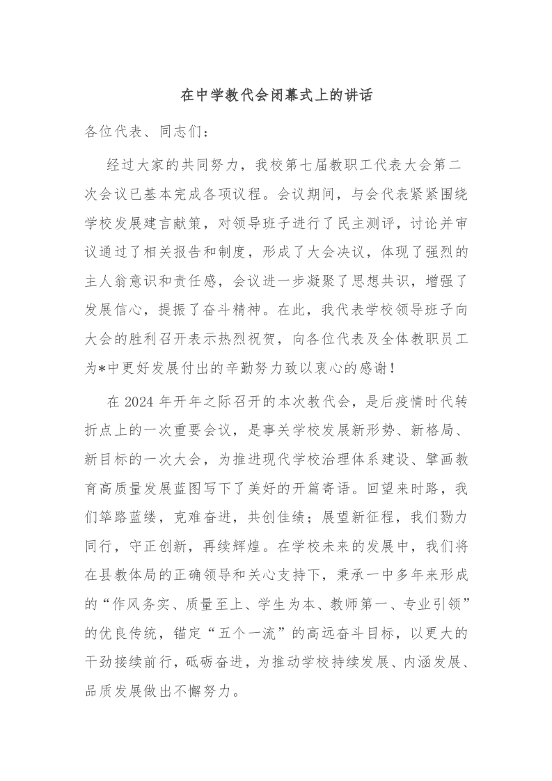 / 在中学教代会闭幕式上的讲话稿