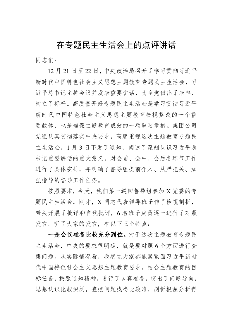 / 在主题教育民主生活会上的点评讲话稿
