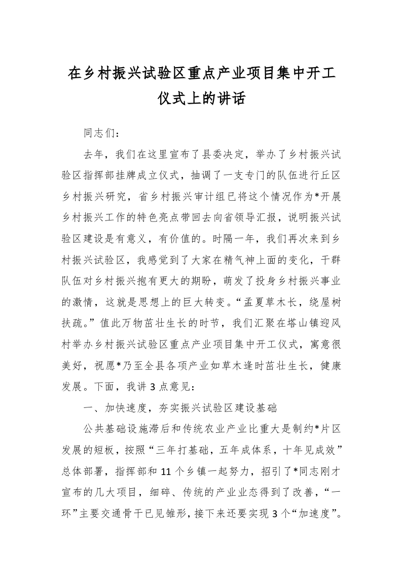 / 在乡村振兴试验区重点产业项目集中开工仪式上的讲话稿