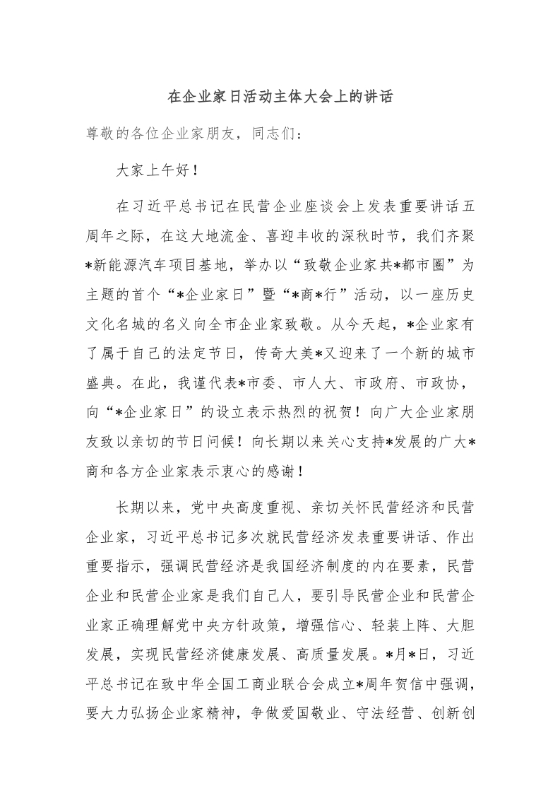 / 在企业家日活动主体大会上的讲话稿