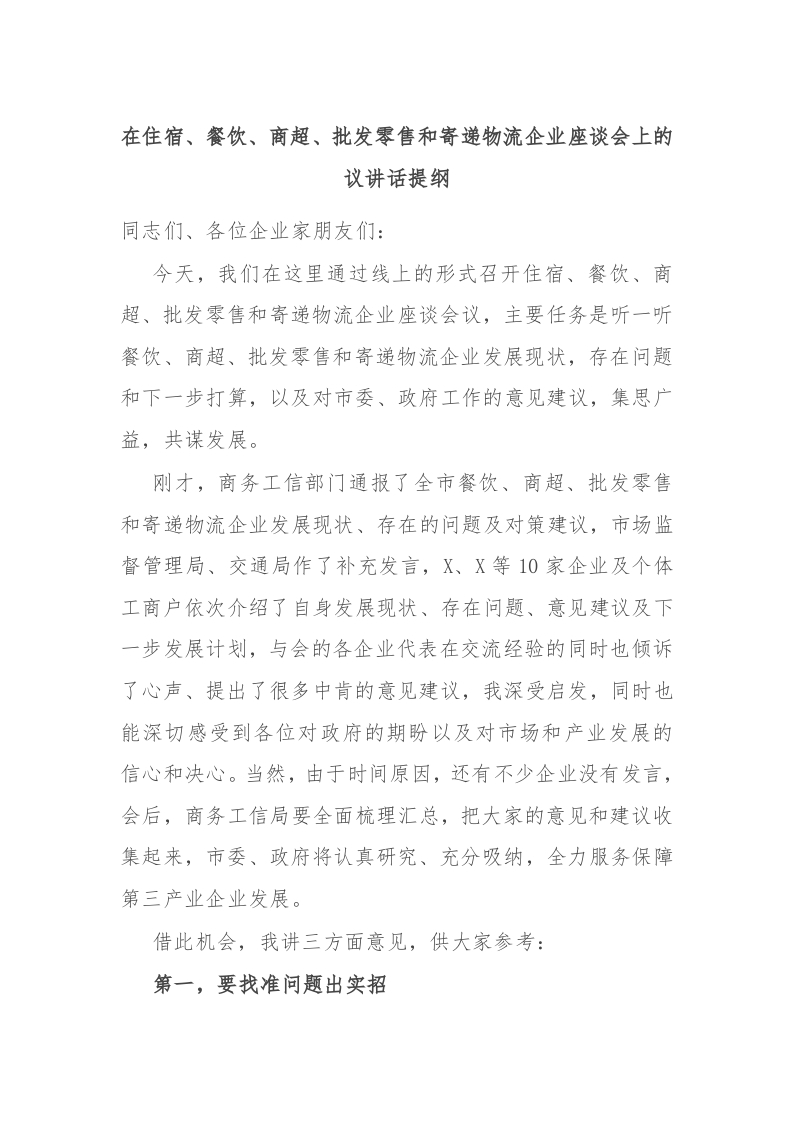 / 在住宿、餐饮、商超、批发零售和寄递物流企业座谈会上的议讲话稿提纲