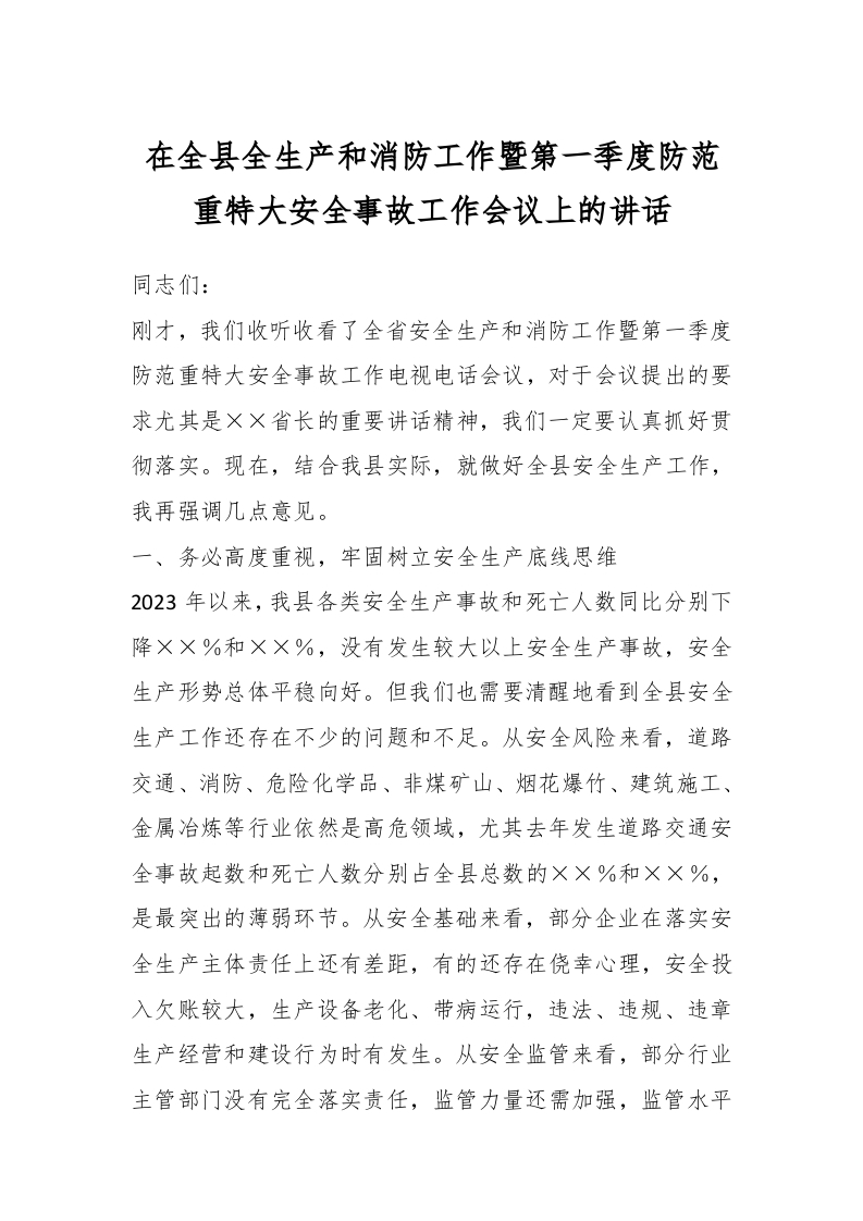 / 在全县全生产和消防工作暨第一季度防范重特大安全事故工作会议上的讲话稿