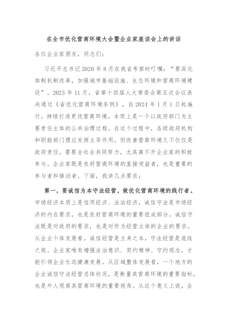 / 在全市优化营商环境大会暨企业家座谈会上的讲话稿