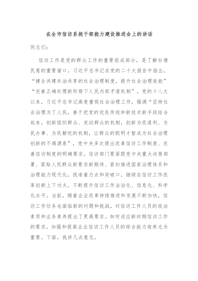 / 在全市信访系统干部能力建设推进会上的讲话稿