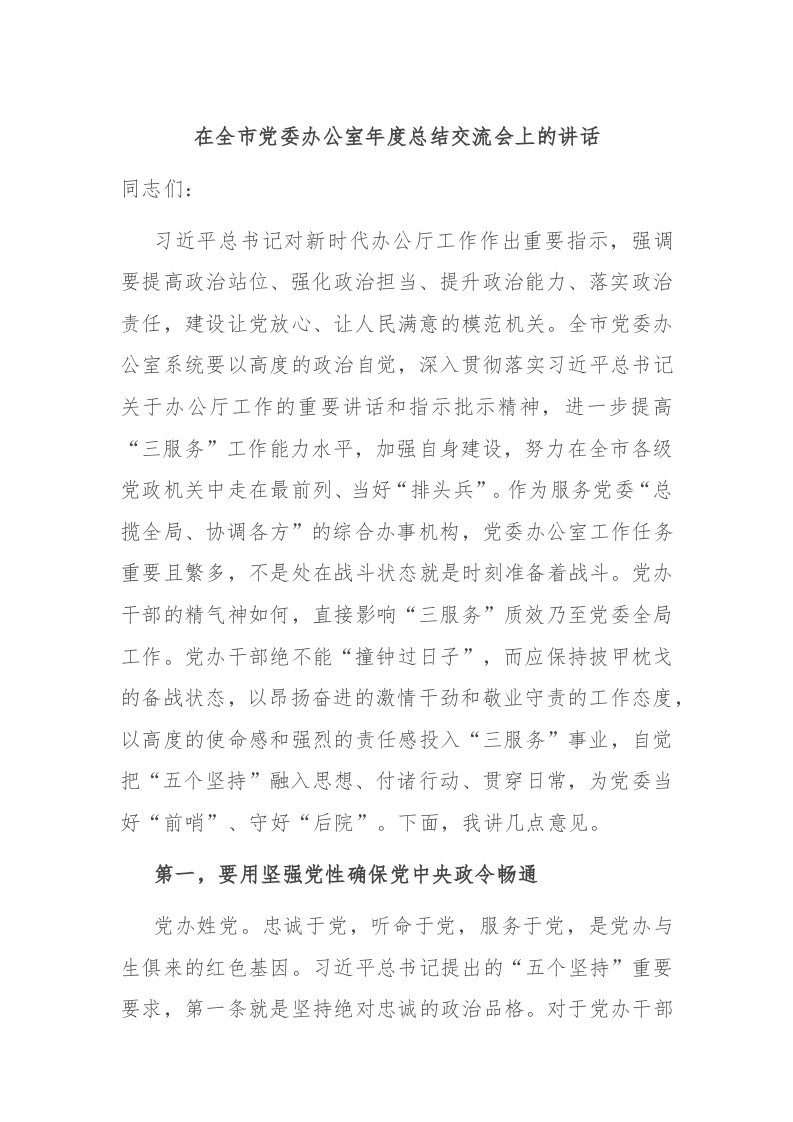 / 在全市党委办公室年度总结交流会上的讲话稿