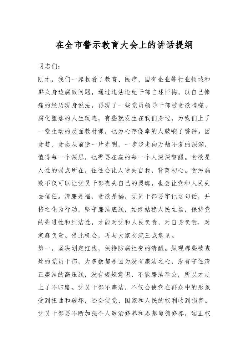 / 在全市警示教育大会上的讲话稿提纲