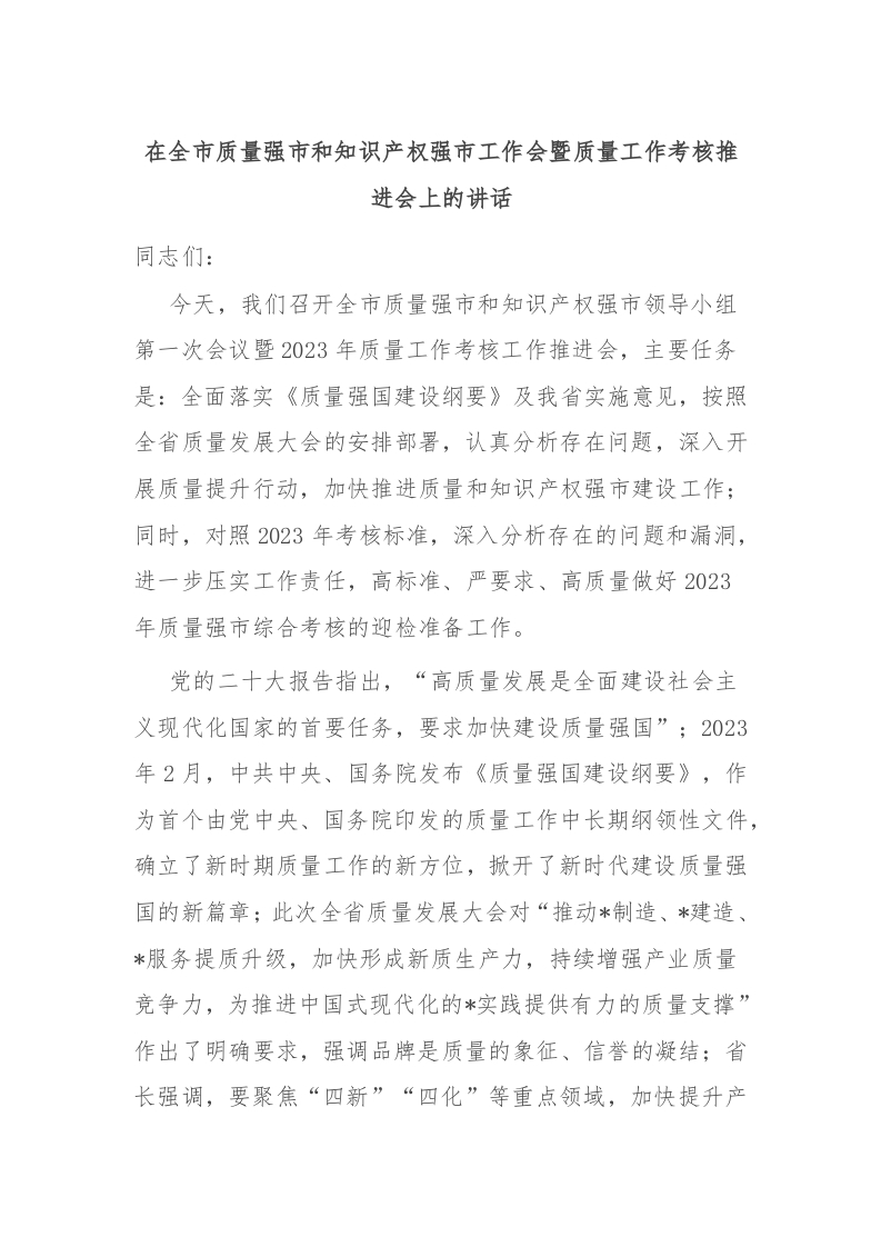 / 在全市质量强市和知识产权强市工作会暨质量工作考核推进会上的讲话稿