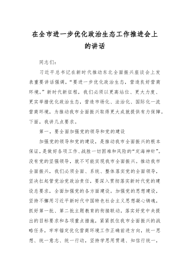 / 在全市进一步优化政治生态工作推进会上的讲话稿