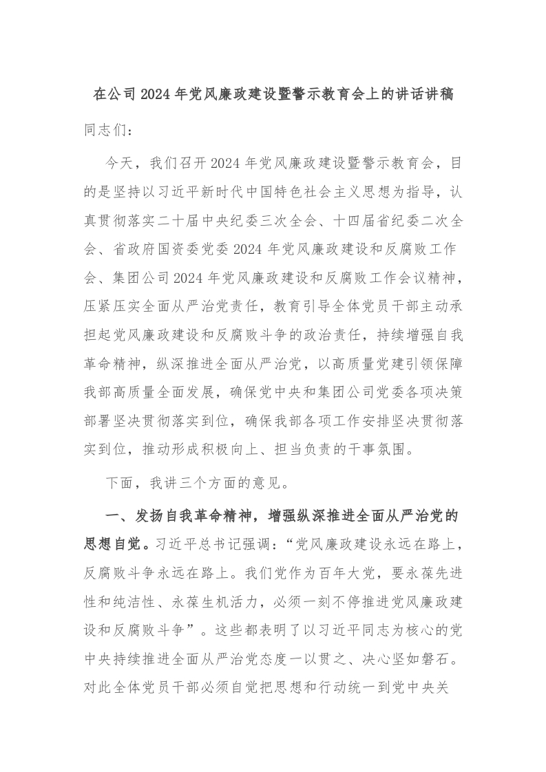 / 在公司2024年党风廉政建设暨警示教育会上的讲话稿讲稿