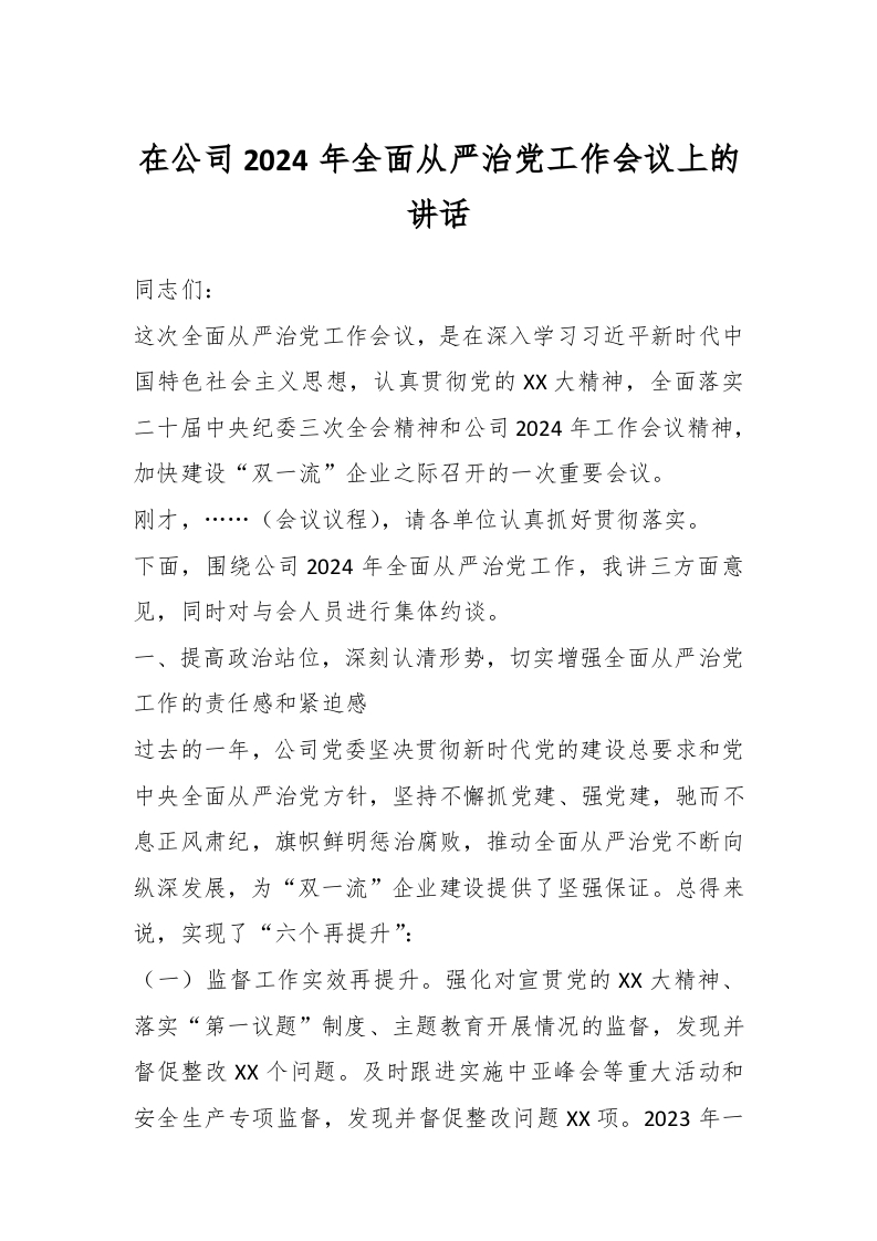 / 在公司2024年全面从严治党工作会议上的讲话稿