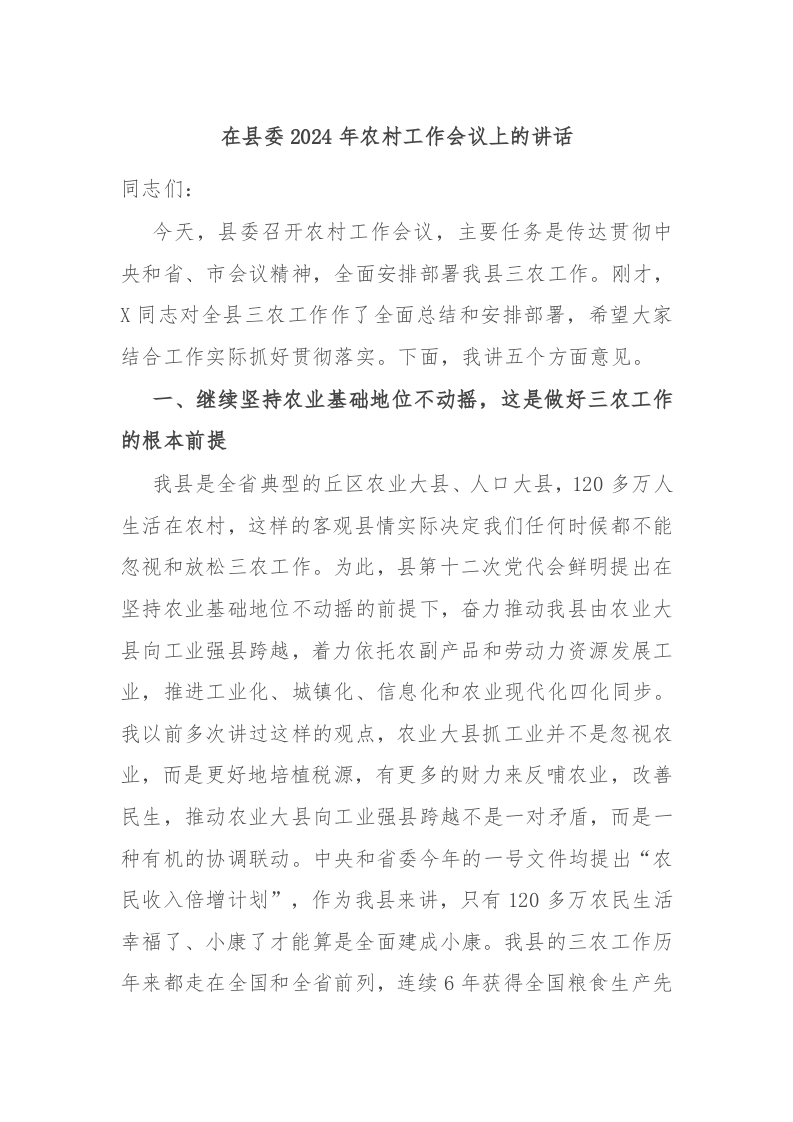/ 在县委2024年农村工作会议上的讲话稿