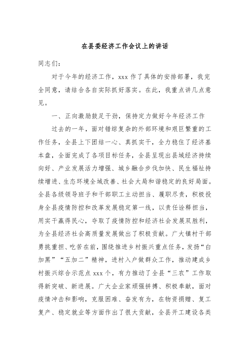 / 在县委经济工作会议上的讲话稿