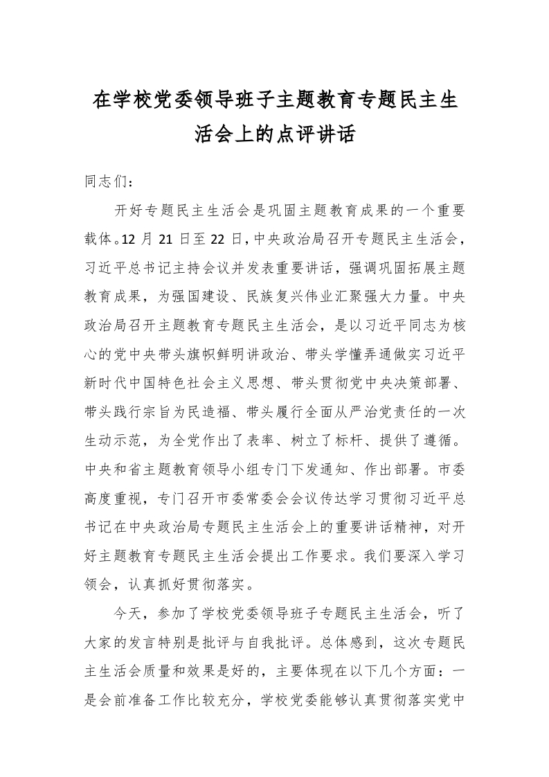 / 在学校党委领导班子主题教育专题民主生活会上的点评讲话稿