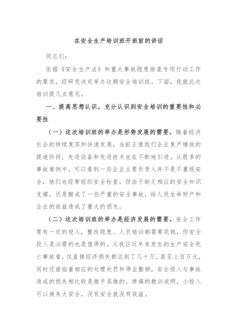 / 在安全生产培训班开班前的讲话稿