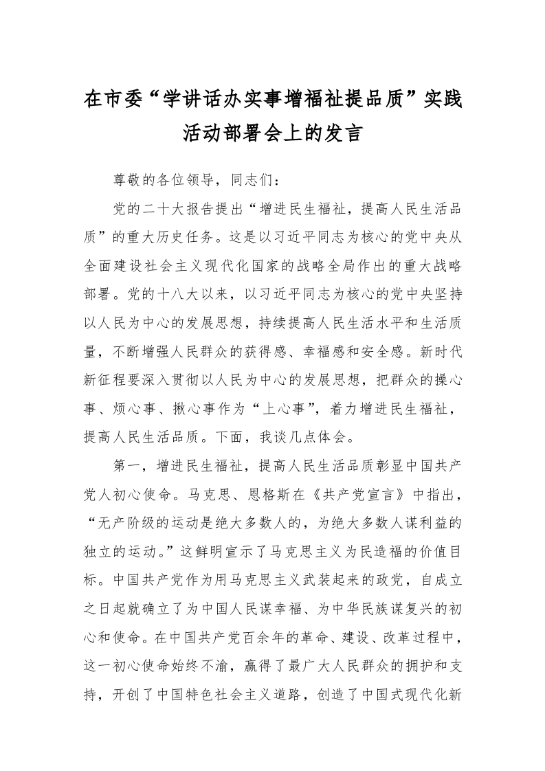 / 在市委“学讲话稿办实事增福祉提品质”实践活动部署会上的发言稿