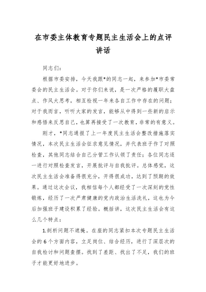 / 在市委主体教育专题民主生活会上的点评讲话稿