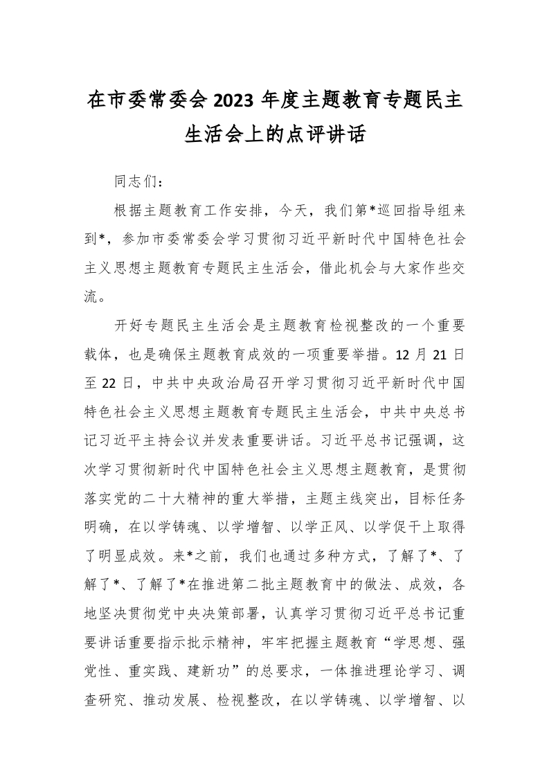 在市委常委会2023年度主题教育专题民主生活会上的点评讲话稿