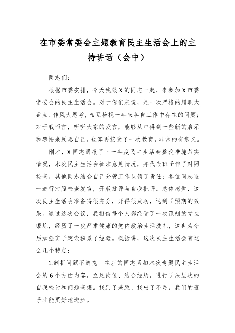 / 在市委常委会主题教育民主生活会上的主持讲话稿(会中)