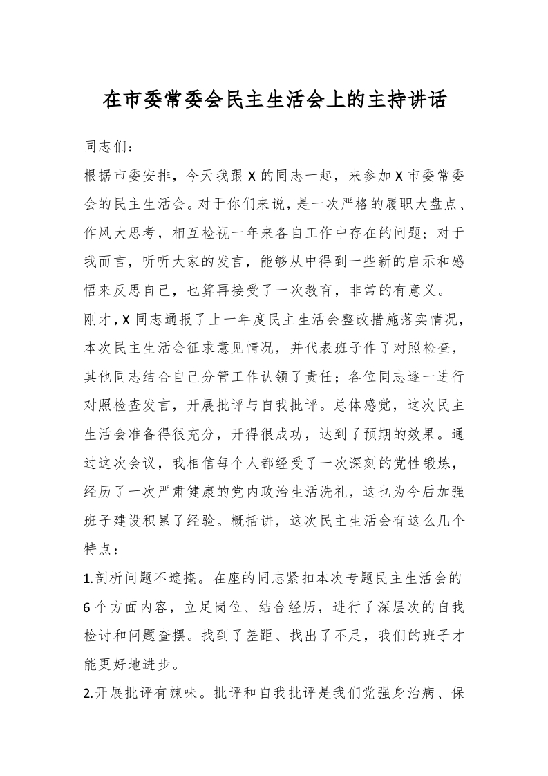 / 在市委常委会民主生活会上的主持讲话稿