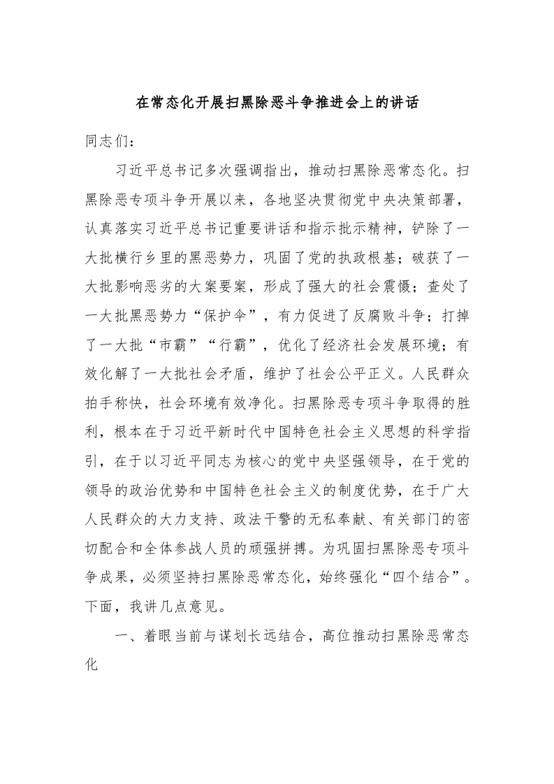 / 在常态化开展扫黑除恶斗争推进会上的讲话稿