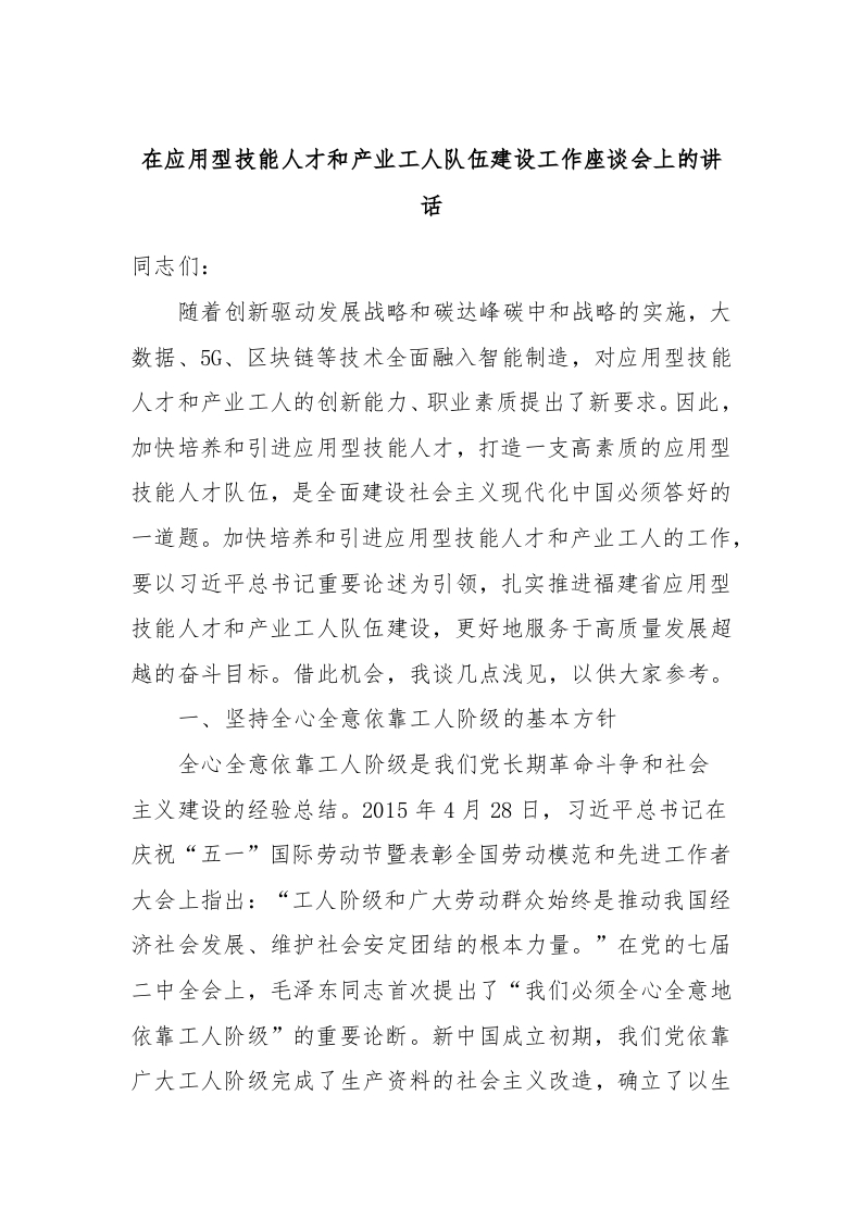 / 在应用型技能人才和产业工人队伍建设工作座谈会上的讲话稿