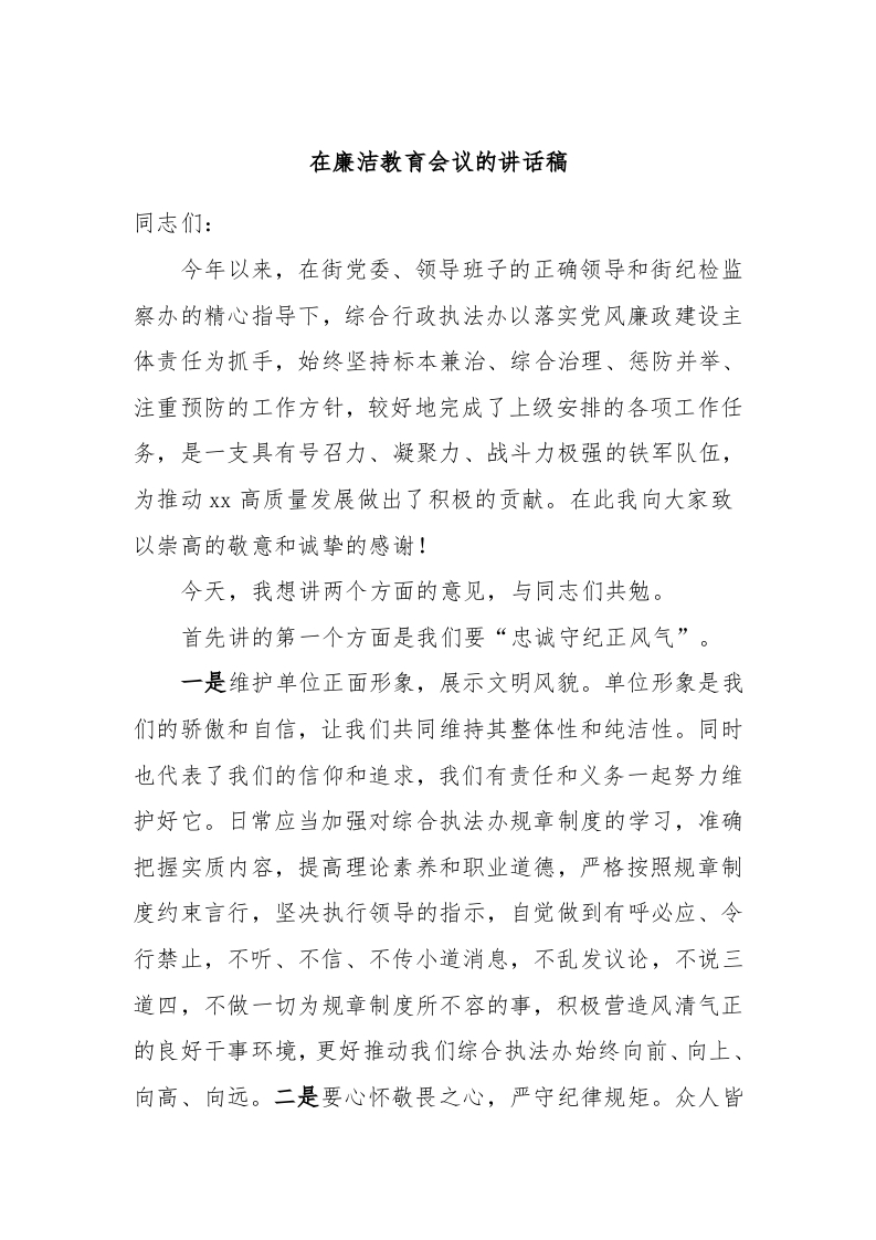 / 在廉洁教育会议的讲话稿稿