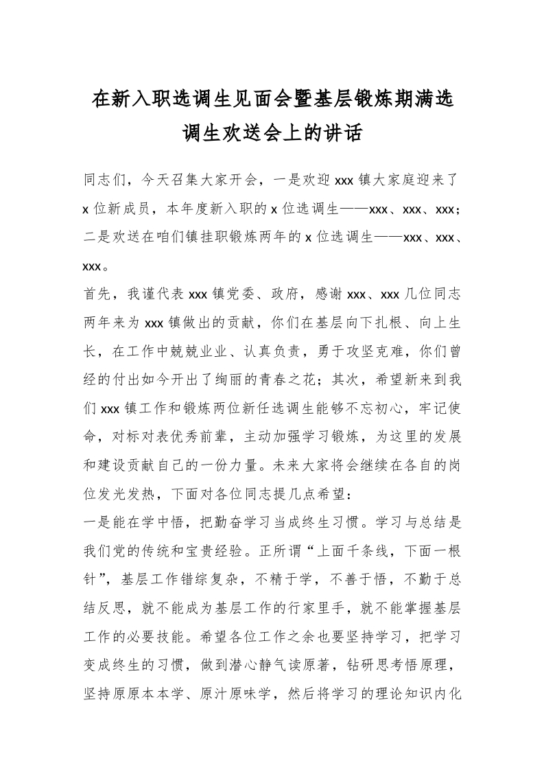 / 在新入职选调生见面会暨基层锻炼期满选调生欢送会上的讲话稿