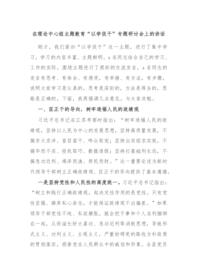 / 在理论中心组主题教育“以学促干”专题研讨会上的讲话稿