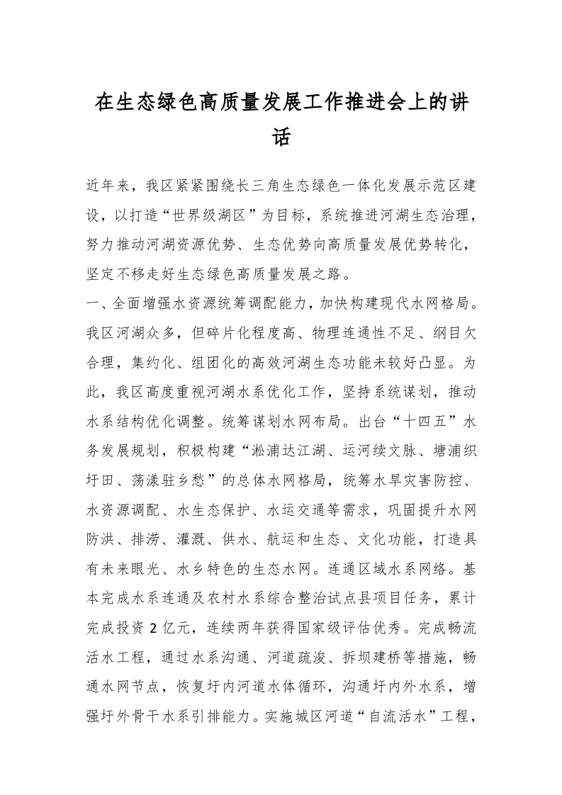 / 在生态绿色高质量发展工作推进会上的讲话稿