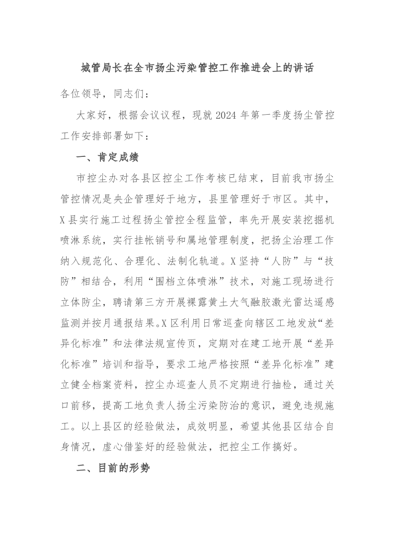 / 城管局长在全市扬尘污染管控工作推进会上的讲话稿