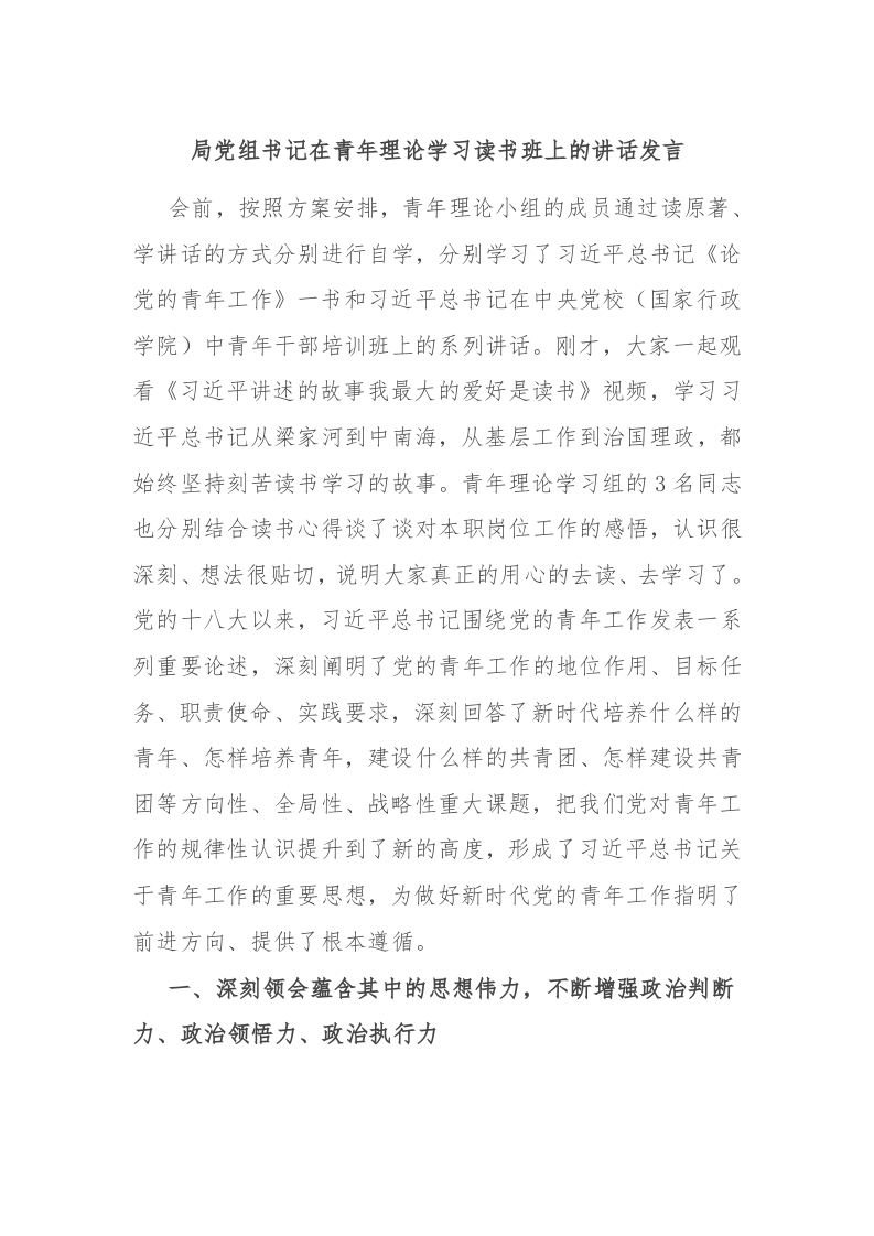/ 局党组书记在青年理论学习读书班上的讲话稿发言稿